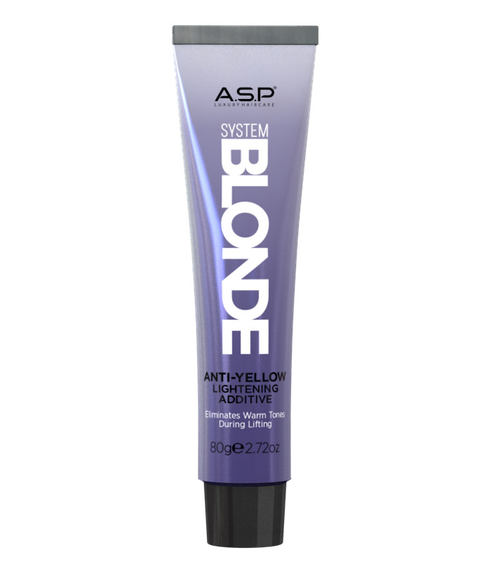 ANTI-YELLOW LIGHTENING ADDETIVE ist eine Creme mit speziellen violetten Pigmenten, die "während des Aufhellungsprozesses" unerwünschte Gelbreflexe entfernt, um ein schönes, klares Blond zu kreieren. ANTI-YELLOW LIGHTENING ADDETIVE kann in jede ASP Blondierung gemischt werden.
