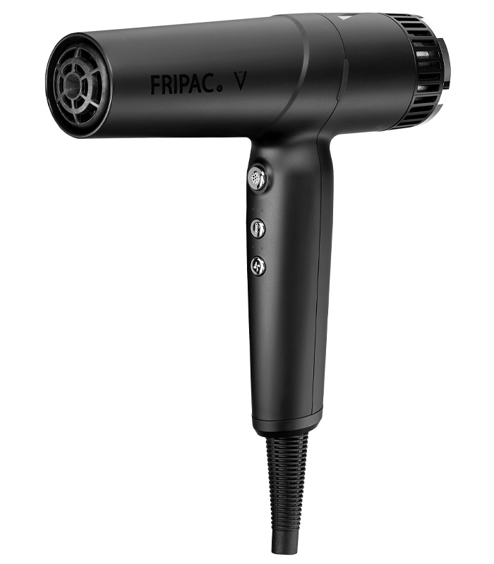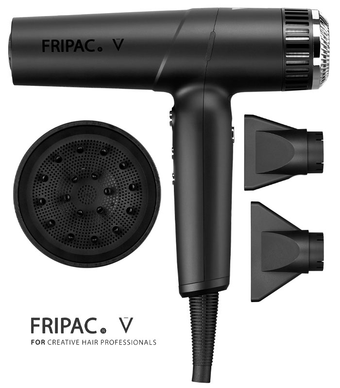 DER NEUE V-HAARTROCKNER VON FRIPAC garantiert mit seinem kraftvollen BLDC Motor hohe Leistung und verringert dadurch die Trocknungszeiten. Der Venturi-Effekt verstärkt den Luftstrom, ohne zusätzlichen Strom zu verbrauchen. Ionentechnologie verleiht dem Haar natürlichen Glanz und reduziert die statische Aufladung.